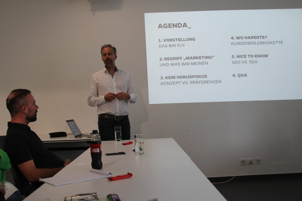 Martin Ming, CEO der eMeM Gmbh, vermittelte den über 20 Teilnehmenden in einer Stunde das Marketing-Einmaleins. «Welches sind nach dem ersten Wahrnehmungs-Push die nächsten Schritte in der Kundenerlebnis-Kette?» U.a. empfahl er, gewisse Mechanismen zu beachten, immer Ziel und Kundensegmente (mit ihrem Nutzungsverhalten und Bedürfnissen) konzeptionell zu definieren. Und beim Einsatz v.a. von SEO bzw. SEA empfiehlt es sich, den Ertrag den Kosten gegenüberzustellen Václav Šulista, Netzwerk- und Social Media-Profi, zeigte den teilnehmenden Business Parc-Mitgliedern, wie man mit wenigen, gezielten Schritten ein starkes LinkedIn-Profil aufbaut.
